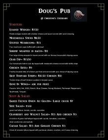 Welcome to Christine's Creekside & Doug's Pub. We offer upscale dining @ Christine's in our window room, consisting of Italian, steaks, and seafood. Doug's pub located in our bar area & deck offers casual laid back atmosphere with sandwiches, salads,& small options. Our patio is pet friendly. Full bar, wine, beer available @ both options. We have a vegetarian menu, gluten free menu, children's menu, martini list, and wine & beer list, we are handicap accessible, main parking lot on the side of building & handicap is on the front of building.